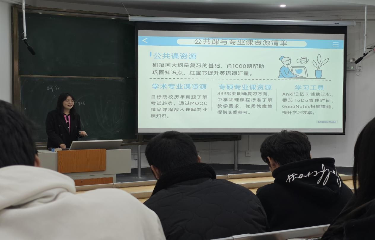 2025年11月5日上午,物电学院在宁静楼435教室成功举办“坚持即胜利:物理学考研规划”专题讲座。本次讲座由高成贵老师主讲,2023级物理学专业全体学生参加,物电学院岳天天老师主持。 高成贵围绕考研初心、成功要素、学硕与专硕区别、复习规划及心态调整等核心内容展开,为有志于考研深造的学子提供了系统性指导,现场互动热烈,学生收获颇丰。 高成贵指出持续学习超过10个月、日均有效学习6小时以上,上岸率可超过80%,并进一步强调了坚持与方法的重要性。针对物理学考研的两大方向——学术型硕士(学硕)与专业型硕士(专硕),详细对比了两者的区别、分析了两种选择的适合对象、考试科目及各自的优势与挑战,帮助同学们根据自身目标做出合理选择。最后,高成贵老师详细讲解了考研复习的三个关键阶段:基础阶段、强化阶段、冲刺阶段,针对英语、高数(一)、专业课等核心科目,提供了具体的复习方法以及公共课与专业课的优质资源清单,帮助同学们高效利用时间,精准复习。针对备考过程中常见的心态波动,高成贵老师给出了实用建议:制定小目标并打卡,每完成一项打勾,逐步建立信心;适度运动,缓解压力,保持身心健康;避免盲目比较,专注自身节奏,减少焦虑。她以温暖的话语鼓励同学们:“坚持终将遇见理想的自己!” 通过本次讲座,进一步帮助备战考研的同学明确了考研目标,理清了复习思路,不再迷茫,助力学子在科研与职业道路上走得更远、更稳。 图文/刘家兴 何莉娜拉 一审/岳天天 二审/蔡晶 三审/刘高福
