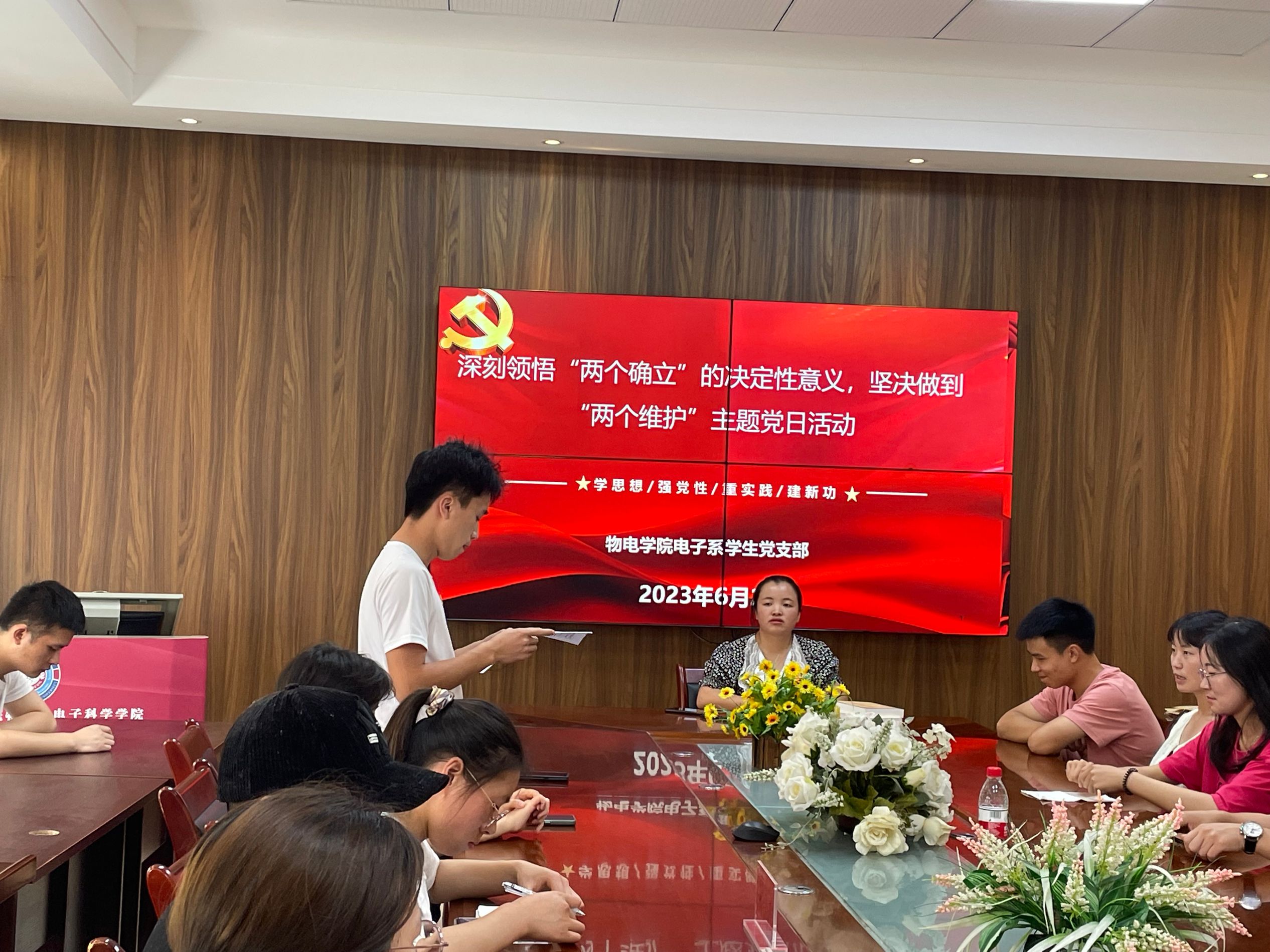 6月2日,学院电子系学生党支部在学院会议室开展深刻领悟“两个确立”,坚决做到‘两个维护’”主题党日活动,本次党日活动由电子系党支部书记雷仕娜主持,支部全体成员参加。 活动开始,雷仕娜以“两个维护”和“两个确立”具体内容提问引入活动主题。接着,通过领学《习近平新时代中国特色社会主义思想专题摘编》与党员们进一步对“两个确立”的决定性意义和“两个维护”的涵义进行学习。最后,党员们结合自身实际进行交流发言。 通过此次主题党日活动,党员们纷纷表示:会不断加强习近平新时代中国特色社会主义思想的学习,做到学思用贯通,知信行统一,为全面建设社会主义现代化国家不断奋斗!