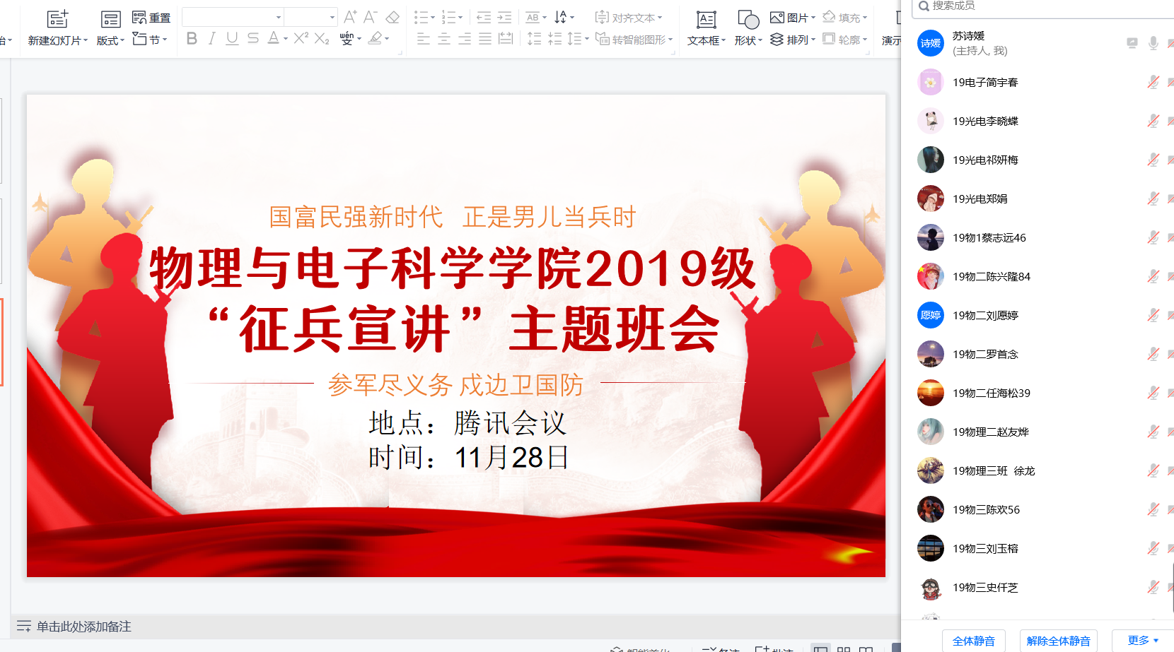 为全面贯彻习近平新时代中国特色社会主义思想,深入贯彻习近平强军思想,以高度的政治责任感和使命感学习宣传贯彻党的二十大精神,坚持人才强军,扎实开展国防教育工作,努力为国防事业输送更多优质兵员,物电学院毕业班班主任苏诗媛组织19级全体学生开展“青春礼赞二十大 强军有我新征程”国防教育线上主题班会。 班会上,苏诗媛首先带领全体学生学习了《高举中国特色社会主义伟大旗帜 为全面建设社会主义现代化国家而团结奋斗——在中国共产党第二十次全国代表大会上的报告》;紧接着,学习了《中华人民共和国兵役法(2021年修订版)》《中华人民共和国退役军人保障法》等国防法规;然后对普通高校学生就业政策、应征入伍政策公告、贵州省征兵工作优抚办法、乌当区征兵优抚办法、yl6776永利集团在校学生应征入伍优抚办法、应征入伍前置招聘等相关内容进行讲解。 最后介绍了大学生兵员征集条件、入伍流程等相关内容,并对同学们的应征入伍问题给与解答。 2023年,是学习贯彻党的二十大精神,深化国防动员体制改革的重要一年,做好征兵工作意义重大、责任重大。希望青年学子响应祖国号召,积极到部队中锻造成长,把聪明才智融入强军梦想,用青春年华谱写壮美人生篇章。