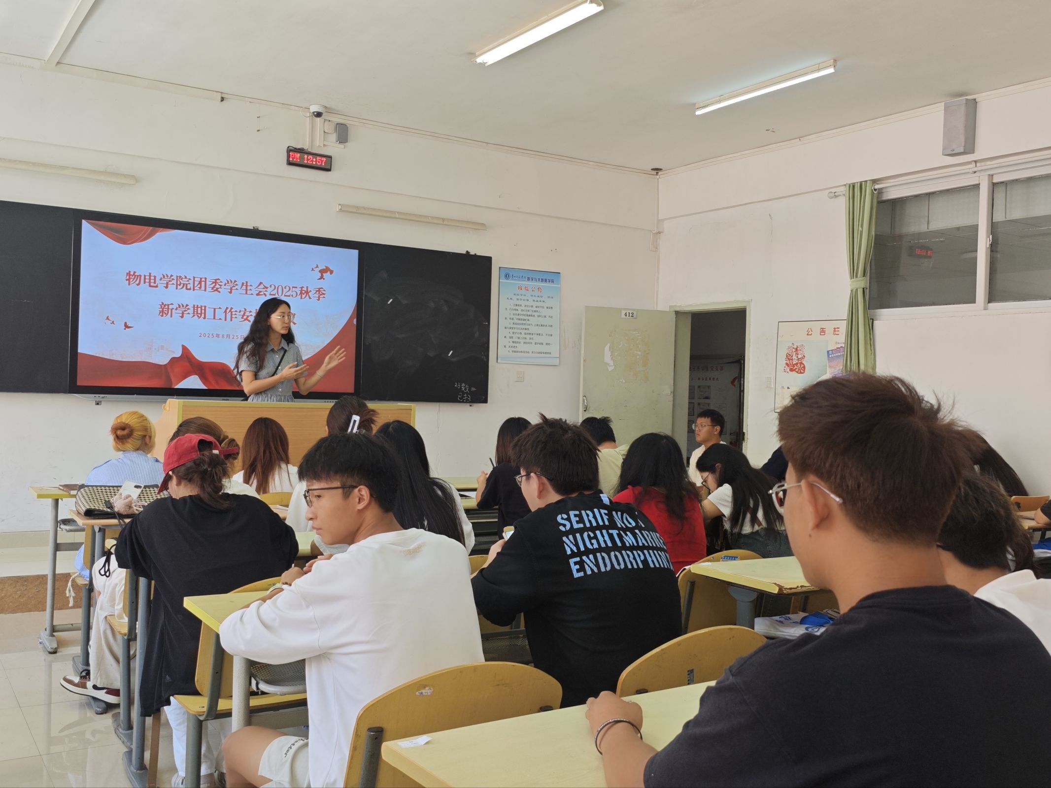 为总结上学期各部门工作情况,部署新学期工作安排,8月25日,物电学院团委学生会在致远楼412教室,召开2025年秋季学期工作部署会。会议由团委负责人苏诗媛主持,学院团委学生会各部门部长参加本次会议。 会议伊始,苏诗媛强调了迎新工作的重要性和紧迫性,并提出具体工作要求,确保迎新工作顺利开展。随后,她针对本学期目标,指出各部门工作中存在的不足,并提出改进建议。接着,对团委学生会各部门的工作进行梳理安排,希望各部门把握住相关时间节点,保质保量的开展活动。 此次会议明确了新学期团委学生会的工作方向与实施路径,进一步统一了思想,调动了成员积极性。大家表示将以更扎实的作风和更创新的思路推进工作,积极服务同学,为学院发展贡献青春力量。