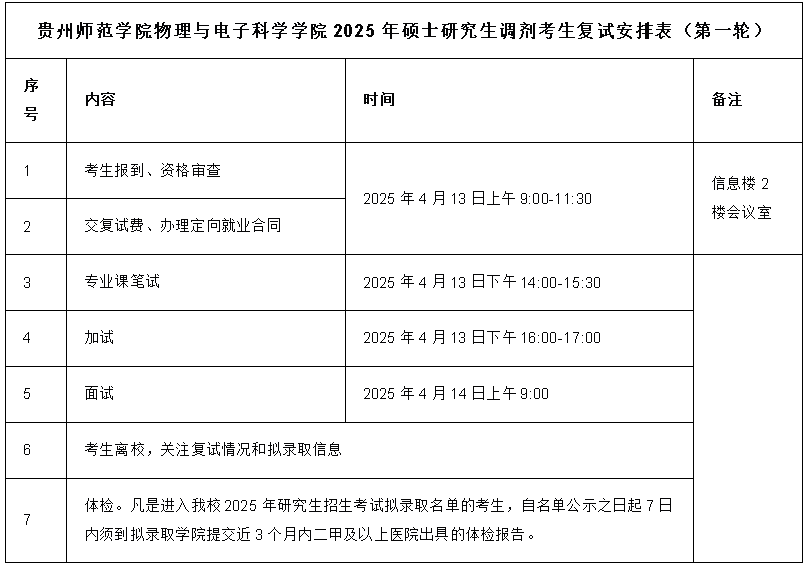 二、调剂基本要求 (一)调剂考生须符合《yl6776永利集团2025年硕士研究生招生章程》中规定的调入专业的报考条件; (二)调剂考生须符合《2025年全国硕士研究生招生工作管理规定》有关调剂的各项规定; (三)我校只接受外国语统考科目为英语的考生调剂; (四)调剂考生初试成绩须同时符合第一志愿报考专业和调入专业在B区的全国初试成绩基本要求; (五)调剂考生第一志愿专业与调入专业相同相近。 三、调剂程序 (一)调剂报名 4月8日“全国硕士研究生招生复试调剂服务系统”开通后,意向调剂我校的考生登录国家研招网办理正式调剂手续。 我校调剂系统首次开放时间为2025年4月8日9:00—4月9日9:00。 第一轮调剂工作结束后,若本专业还有调剂缺额,我校将另行公布接收调剂专业信息和调剂系统开放时间。 (二)调剂复试资格确认 学院根据缺额情况,严格按照调剂要求处理调剂申请,逐一对所有填报调剂申请的考生进行排序遴选,确定符合条件的考生进入复试,并通过研招网调剂系统管理平台对进入复试的调剂考生发送复试通知;调剂考生须在规定时间内(4小时)进行回复,逾期不回复者视为自动放弃复试资格。 (三)调剂复试 请意向调剂我院的考生参照我院网站公布的2025年硕士研究生复试录取工作实施细则,提前做好各项准备工作,具体调剂复试时间及工作安排详见附表1。 (四)待录取通知 我校根据各招生学院复试进度,及时通过研招网调剂服务系统向待录取考生发送待录取通知,待录取考生须在规定时间内接受或拒绝待录取通知,逾期不确认者视为放弃待录取资格。 四、联系方式 学院咨询电话:17785100036 15185180206 学院咨询联系人:韩老师 高老师 电子邮箱:3939421741@qq.com 6776永利集团 研究生招生工作领导小组 2025年4月3日 附表1: