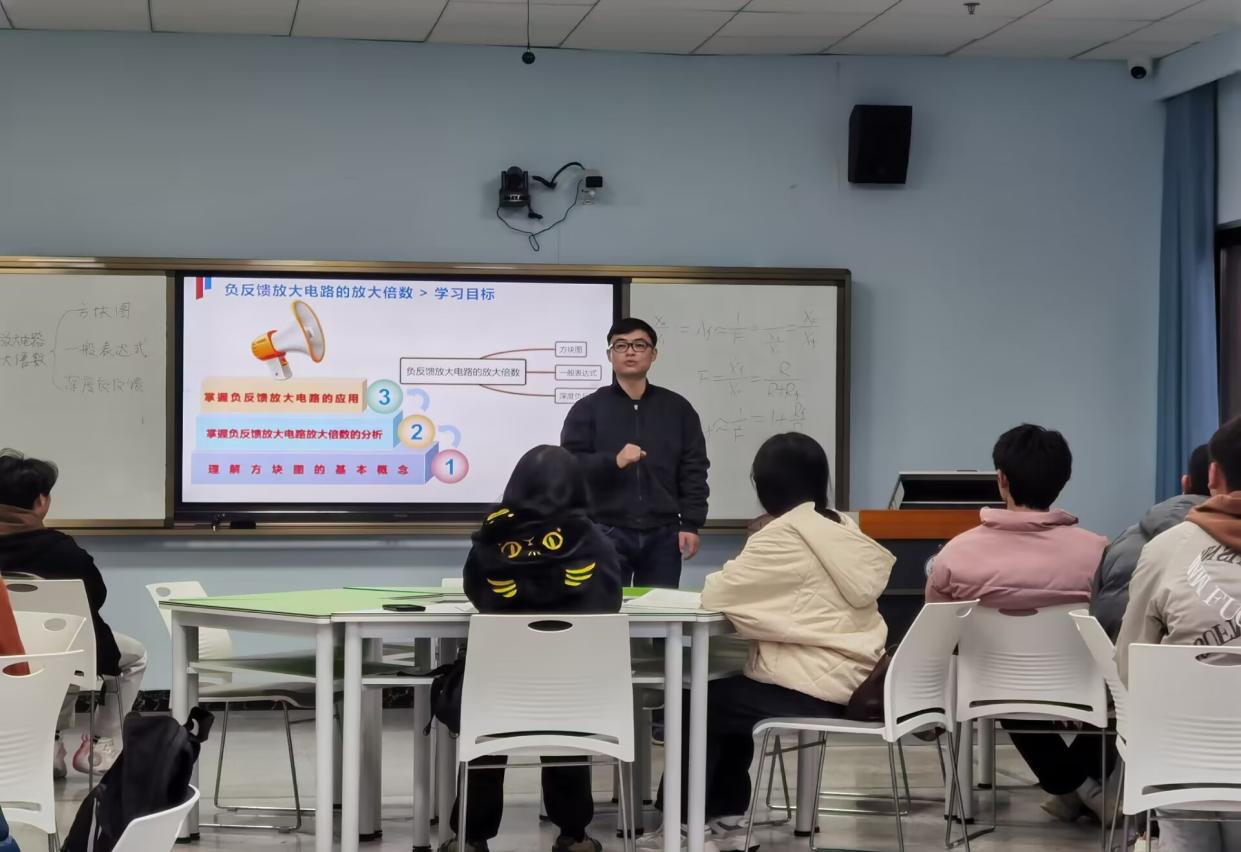 2023年11月30日物电学院在综合实训楼406教室开展了教学节示范课活动,本次示范课莫章洁老师主讲,授课班级为2022级光电信息科学与工程班,授课内容为《模拟电子技术课程》中的“负反馈放大电路的放大倍数”。 首先,莫老师带领大家一起复习了上节课的知识点并引出本堂课内容,接着,在介绍了负反馈放大电路的基本概念后,引导同学们推导出放大倍数的相关公式以及怎样判断反馈电路。在课堂教学中,同学们与莫老师积极互动,莫老师还用了自己制作的教具给同学们演示了负反馈放大电路的实际构成和应用效果。最后,莫老师以提问学生和解题的方式了解同学们对本次课的掌握程度并对此次课程做出最后总结,通过“学而不思则罔,思而不学则殆”的名言,引导学生课后学习和思考相结合。示范课结束后,参与本次示范课的老师对本次授课展开激烈讨论,指出课程中的亮点和不足之处并提出建议。 本次示范课充分发挥了我院优秀教师的示范引领作用,促进教师之间教学经验、教学方法等的学习交流,落实立德树人根本任务,引导高校教师潜心教书育人,进一步提高了我院教师的教育教学水平。