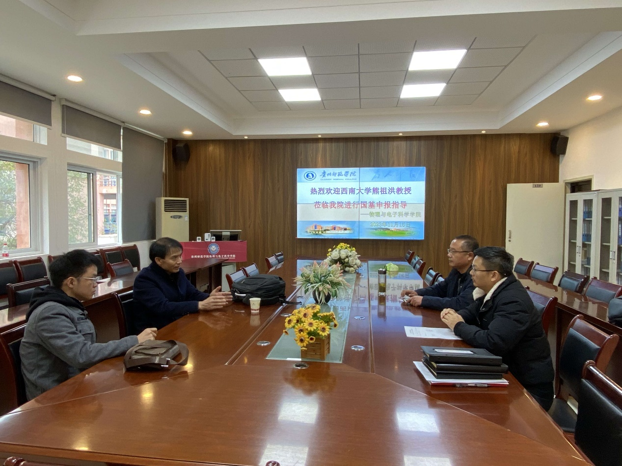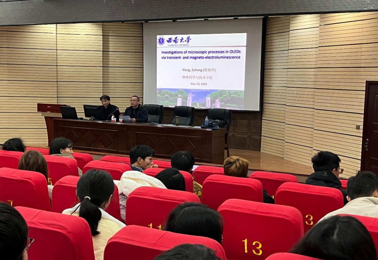 2023年11月15日上午,西南大学物理学院熊祖洪教授为我院师生展开了题为” 采用瞬态电致发光和发光磁效应研究OLEDs的微观演化机制”的学术讲座。其间熊教授对其课题组近年来通过磁效应(magneto-electroluminescence: MEL)和瞬态电致发光(transient electroluminescence: TEL)作为有机发光二极管(OLEDs)中发光中载流子和激子演化行为的探测工具取得的科研成果做出了深入浅出的介绍。并与在场师生开展热烈的学术讨论,同时对研究生选拔和培养等学生关注的问题做了详细的介绍。 · 讲座之后熊教授在我院会议室开展了2024年国基金申报指导活动。期间熊教授针对两位青年教师的科学研究问题展开了细致深入的交流,对今后的研究工作规划、研究困难的突破方法等方面提出了宝贵意见,并承诺后续可以按照需求进一步详细指导基金申报的具体内容,同时可以为后续的研究工作提供良好的条件支持以及合作空间。 通过此次学术交流工作,不仅使我院师生对有机发光二极管的基本机理上有了深刻的认识,拓展了了大家的科学视野,更是了解到科学研究对严谨工作态度的要求,同时对参会老师在今后基金申报工作中产生了积极的意义。讲座和会议均由学院陈德良副院长主持。